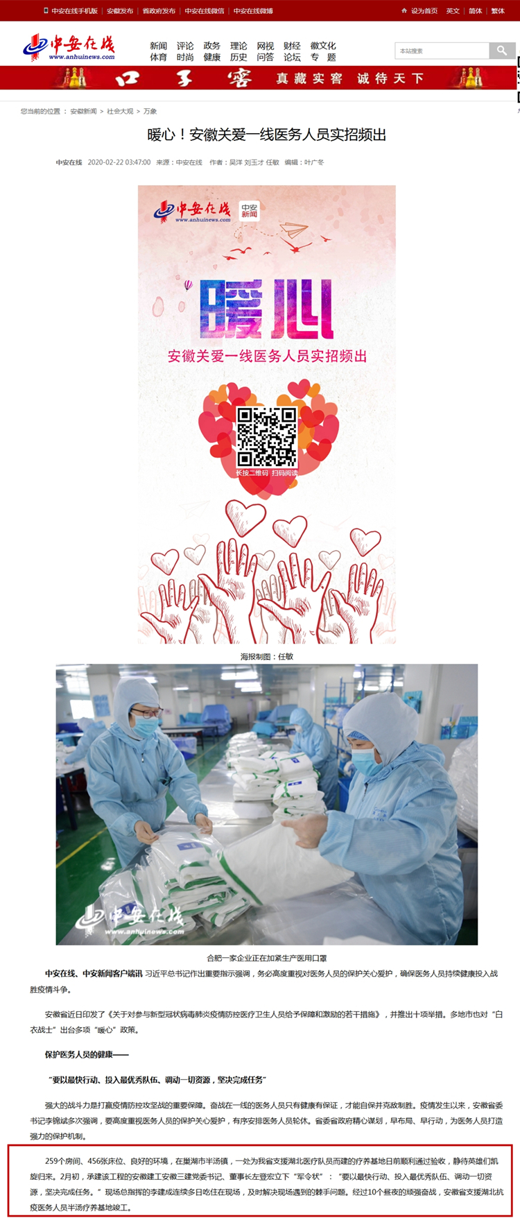 中安在線、央廣網(wǎng)、中新網(wǎng)、國際在線——暖心!安徽關(guān)愛一線醫(yī)務(wù)人員實(shí)招頻出 發(fā)布時(shí)間:2020-02-26 來源:中安在線、央廣網(wǎng)、中新網(wǎng)、國際在線 撰稿人: 瀏覽次數(shù):15517 網(wǎng)址鏈接: 中安在線:http://ah.anhuinews.com/system/2020/02/22/008352394.shtml 央廣網(wǎng):http://news.cnr.cn/native/gd/20200222/t20200222_524987284.shtml 中新網(wǎng):http://www.chinanews.com/sh/2020/02-22/9101239.shtml 國際在線: http://news.cri.cn/20200222/6faa4074-5d1b-ef06-5944-b8a7ca8d5931.html