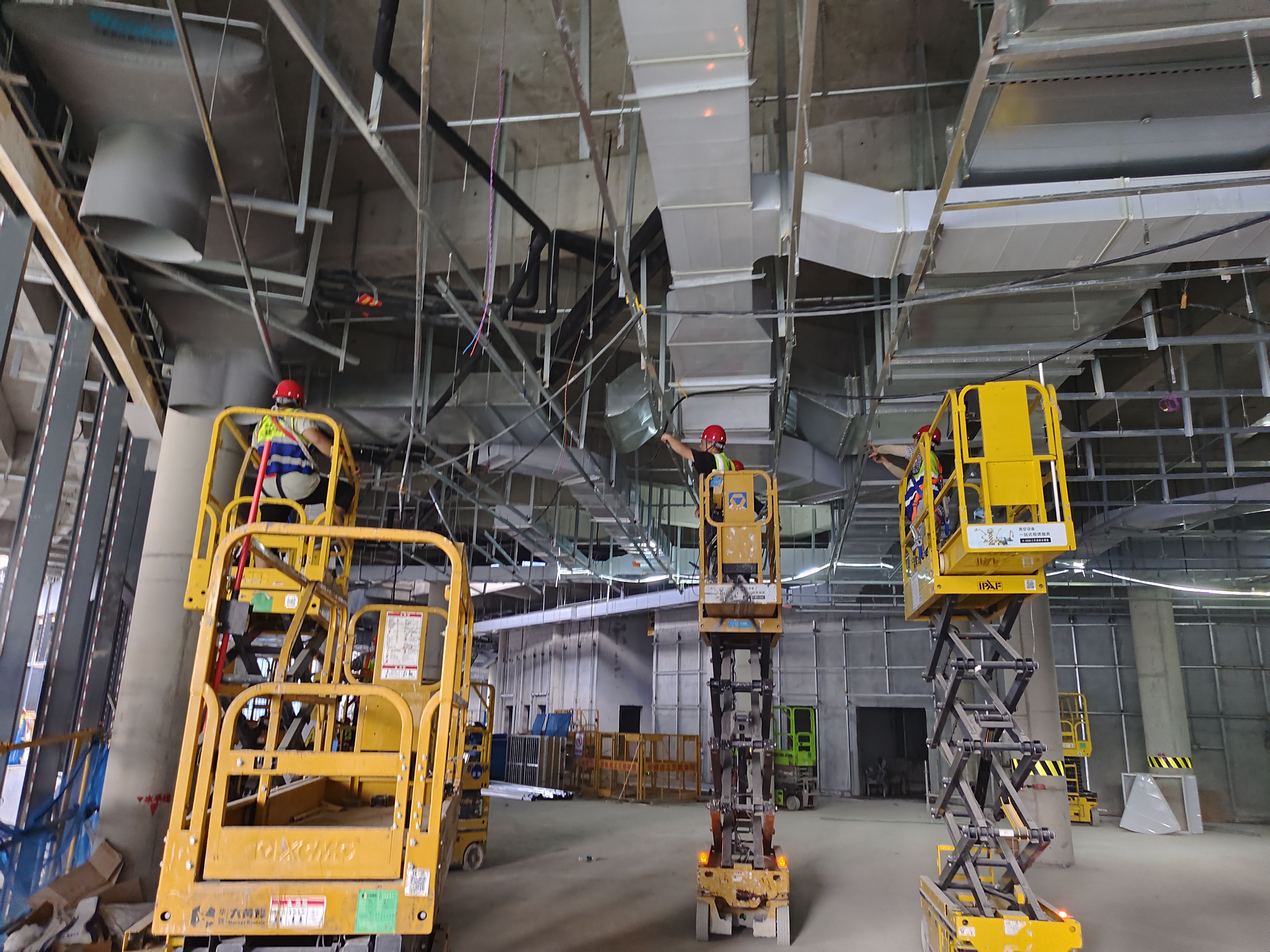 為應對項目施工中的“高熱地帶”,項目團隊精準施策:一方面加大硬件投入,部署強力風扇攪動空氣,有效降低核心作業區溫度;另一方面,針對陽光直射的工作面,專門在曲臂車上架設遮陽傘,為工人營造出相對涼爽的作業環境。