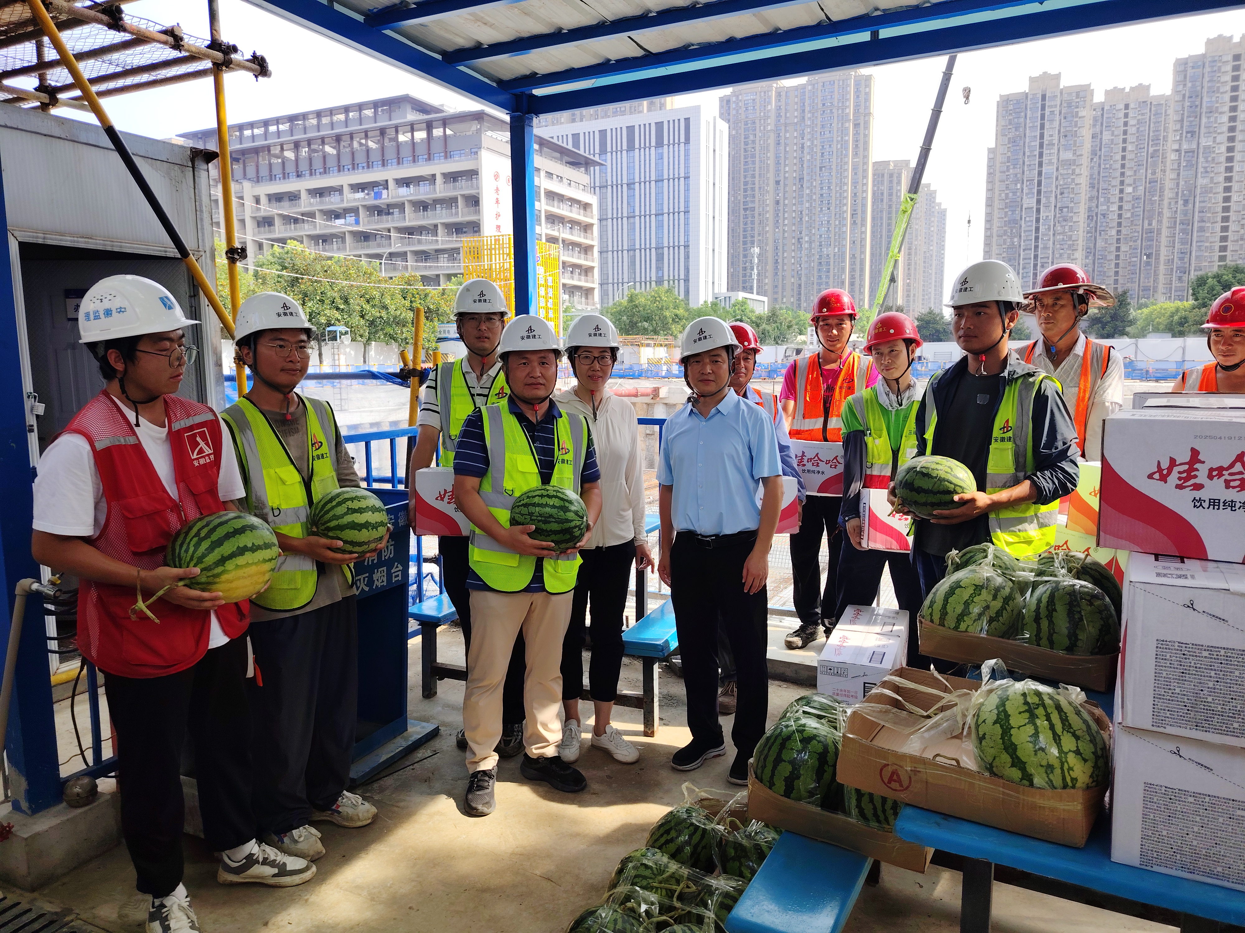 在項目施工現場,陳華一行為工人們送上精心準備的防暑降溫物資,包括甘甜多汁的西瓜、清涼解渴的礦泉水以及藿香正氣水等防暑藥品。陳華親切詢問工人們的工作和生活情況,叮囑大家要合理安排作息時間,切實做好高溫防護,確保身體健康和施工安全。