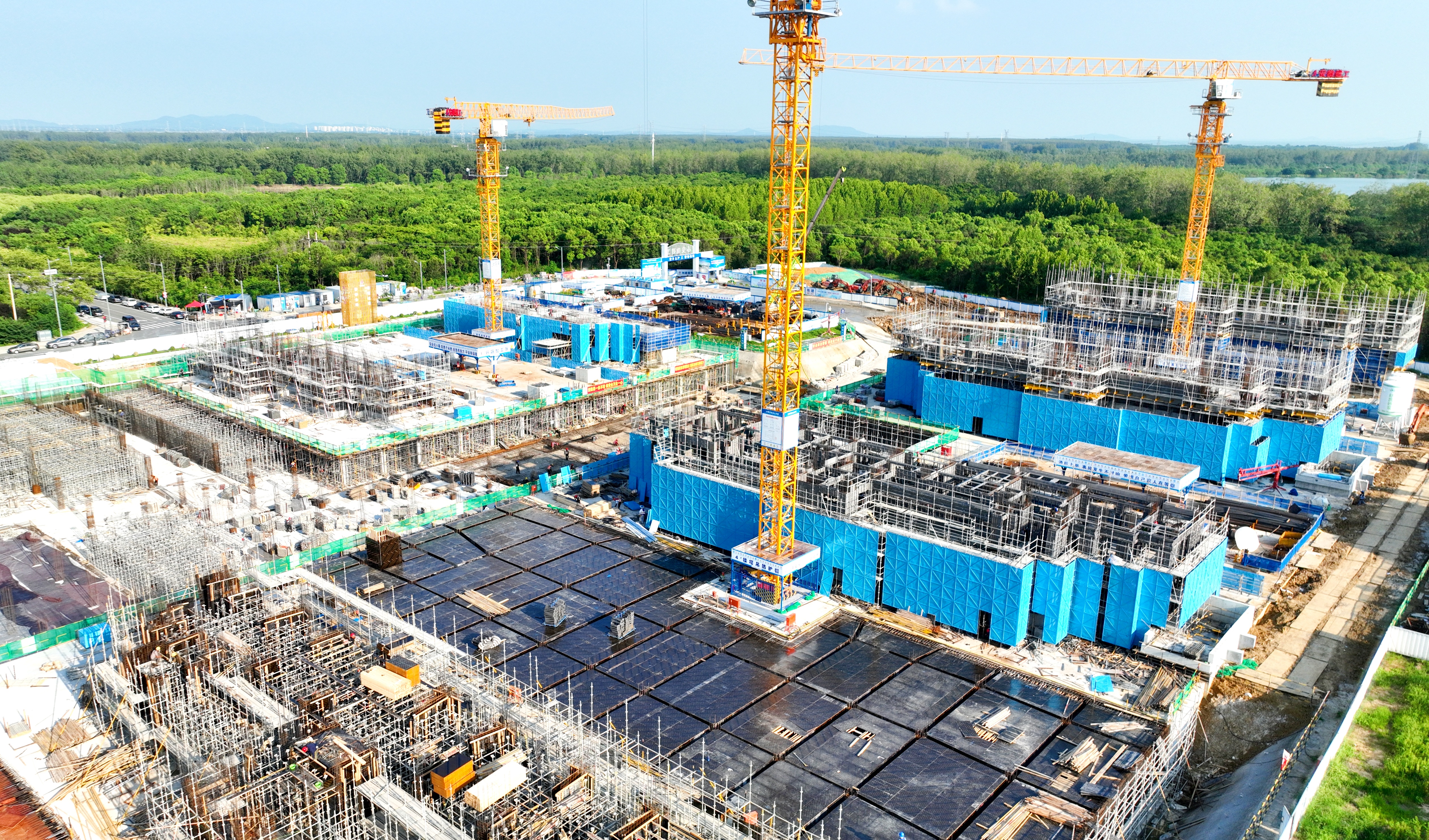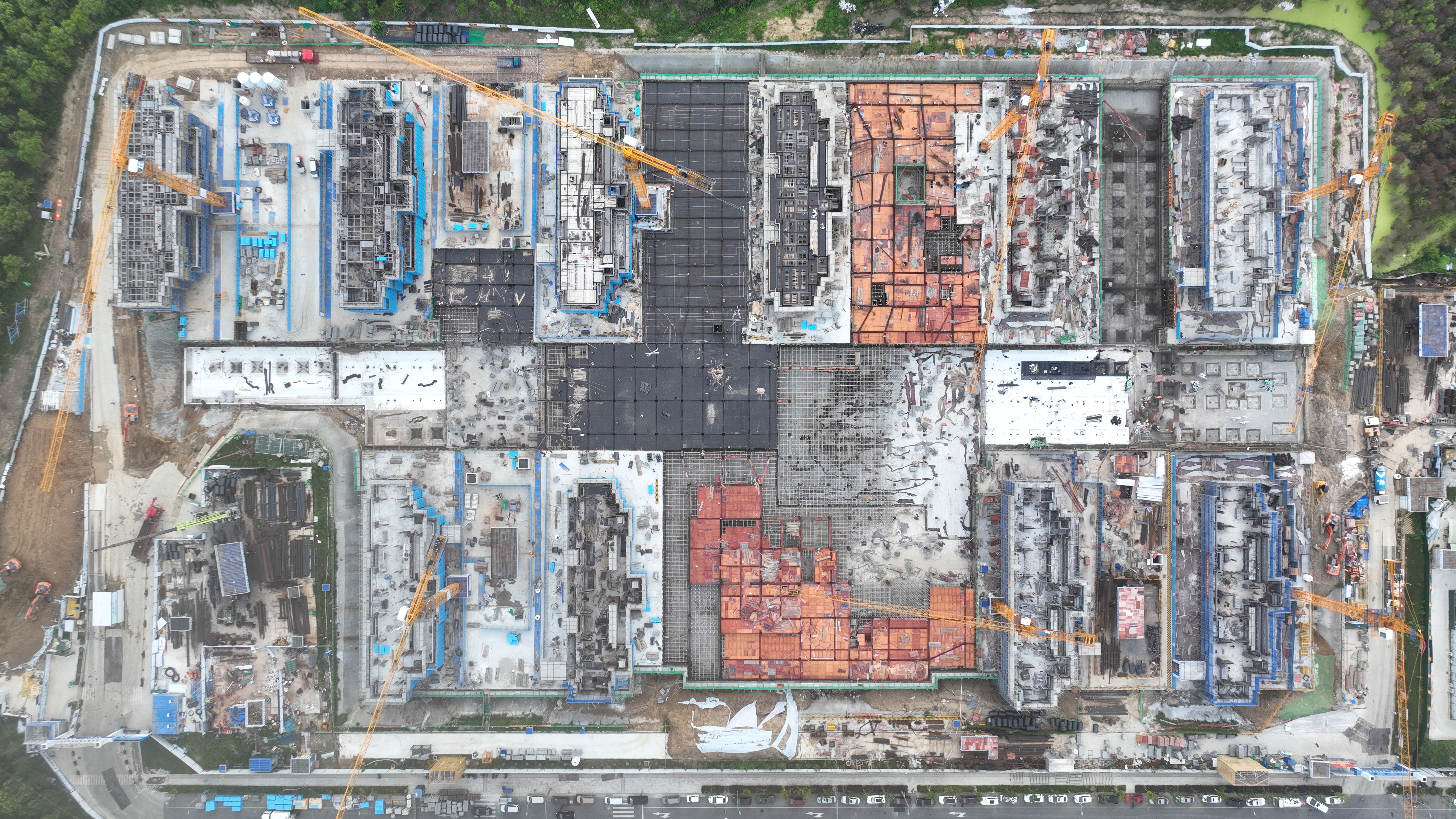 地庫4區頂梁板鋼筋綁扎完成75%;地庫5區正進行頂梁板模板鋪設;地庫2區正進行頂梁板模板鋪設;地庫6區北側內架搭設完成;地庫7區、6區南側正進行防水施工。